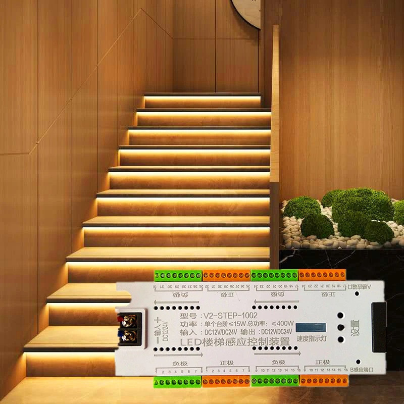 Контролер інтерактивної світлодіодної підсвітки V2-Step-1002 дає змогу організувати автоматичне освітлення драбини залежно від напрямку руху людини. Пристрій забезпечить плавне увімкнення і вимкнення кожної окремої сходинки (не більш ніж 32), додатковий комфорт, а також чудовий візуальний ефект.