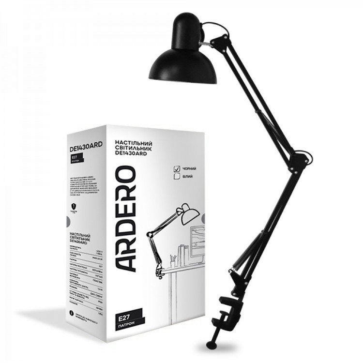 Настільний світильник Ardero DE1430ARD на струбціні під лампу Е27 чорний 335х335х155 мм