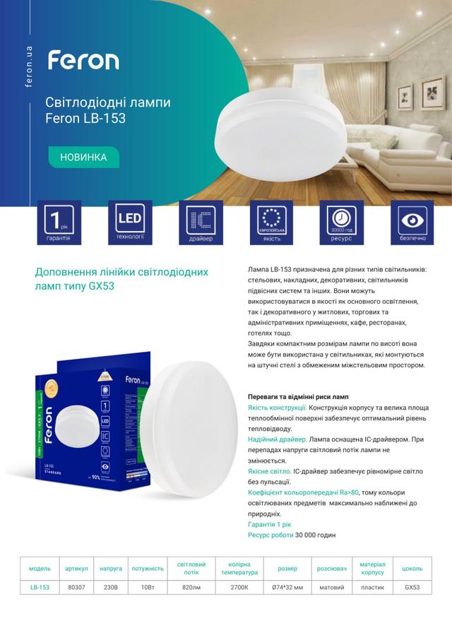 Інтернет-магазин "Світлотехніка для Вас" пропонує новинку від відомої торгової компанії Feron - лампу світлодіодну c патроном GX53 потужністю 10W 2700K - LB153.