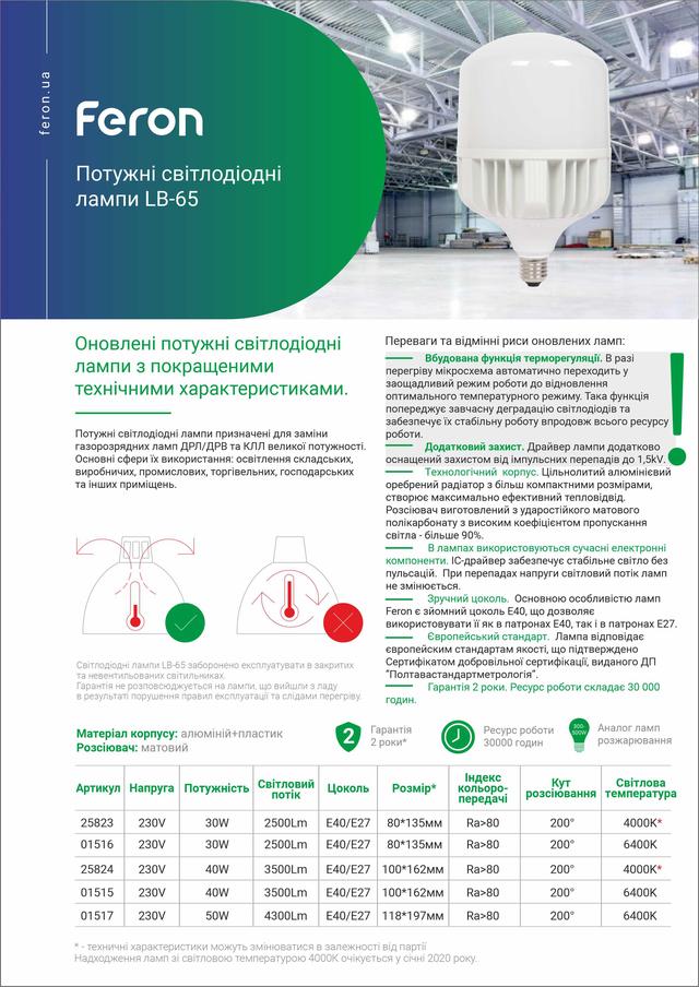 Інтернет-магазин "Світотихника для Вас" пропонує новачку від відомої фірми-провіделя FERON лампу світлодіодну високомощену LB-65 30W 64000К з універсальним патроном E27-Е40.